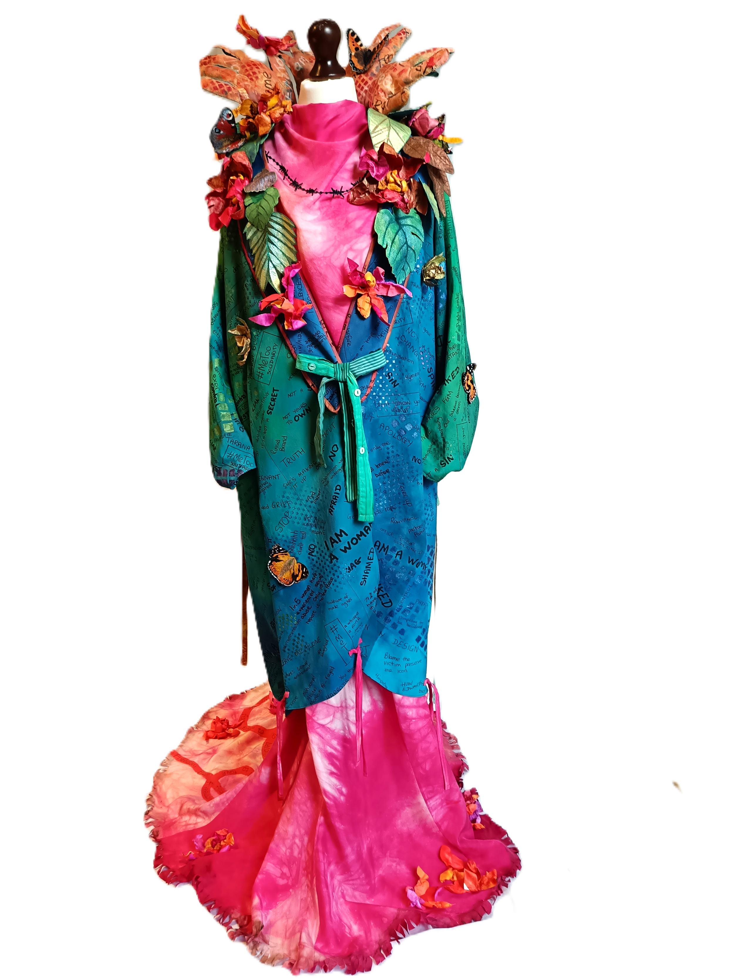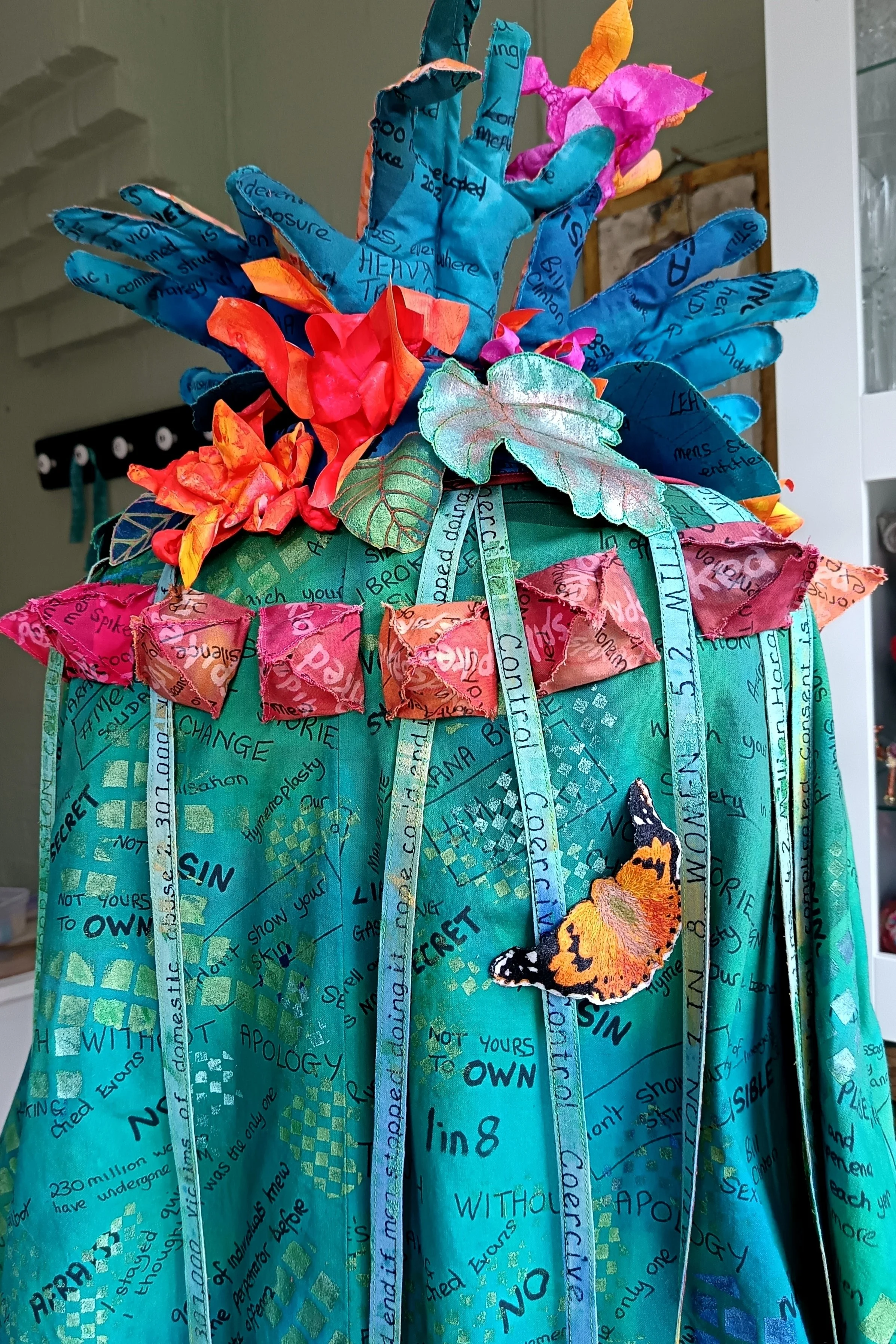 The title references Paul Poiret’s hobble skirts which were cut so narrowly from knee to ankle that women could scarcely walk, sometimes even binding their legs to stop seams from splitting. I have remade his design for a coat, using dye in peacock colours over digitally designed cloth which has fragments of text and statistics relating to harm and control. Trailing ribbons. spikes and hands encircle the body, but over this language of restraint and pain leaves unfurl, flowers push through, butterflies flutter as symbols of resistance, renewal and hope.